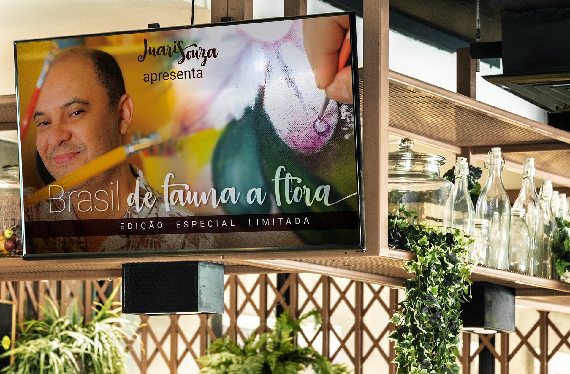 O livro, de capa dura com 116 páginas, tem uma proposta nova: ensinar técnicas de pintura em tecido com temas baseados na natureza do Brasil. O artesão Juari Souza tem grande público na tv especializada e para valorizar seu trabalho e sua imagem, optei por enquadrá-lo em ação, brincando com a ideia de pintar na tela.